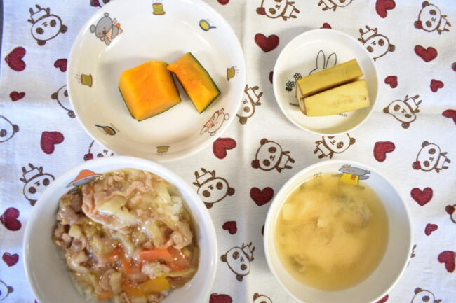~ 今日の給食 ~ ・豚肉のみそ焼き ・かぼちゃの煮つけ ・ごはん ・わかめとえのきのすまし汁 ・パイン ~ 今日のおやつ ~ ・牛乳 ・マシュマロコーンフレーク