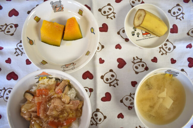 ~ 今日の給食 ~ ・中華丼 ・かぼちゃの煮つけ ・お麩とわかめのみそ汁 ・バナナ ~ 今日のおやつ ~ ・牛乳 ・マシュマロサンド