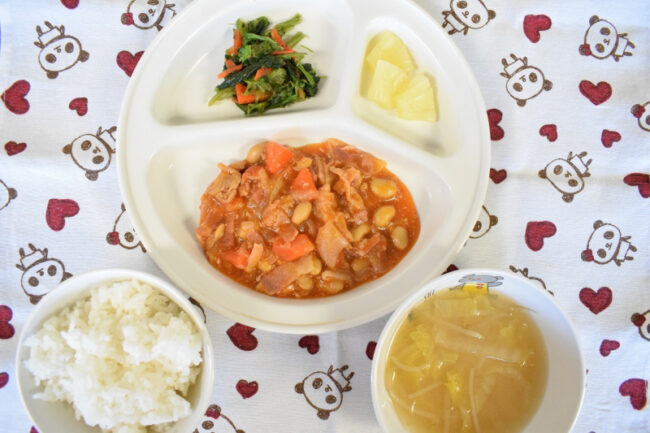 ~ 今日の給食 ~ ・ポークビーンズ ・ほうれん草のおかか和え ・ごはん ・白菜ともやしのみそ汁 ・パイン ~ 今日のおやつ ~ ・牛乳 ・お麩ラスク