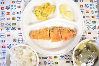 ~ 今日の給食 ~ ・鶏肉のパン粉焼き ・根菜のほっこり煮 ・ごはん ・キャベツと油揚げのみそ汁 ・もも ~ 今日のおやつ ~ ・牛乳 ・マシュマロサンド