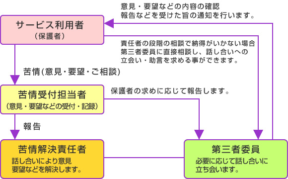 社会福祉法第82条の規定により、本事業所(保育所)では、利用者からの苦情に適切に対応する体制を整えることといたしました。